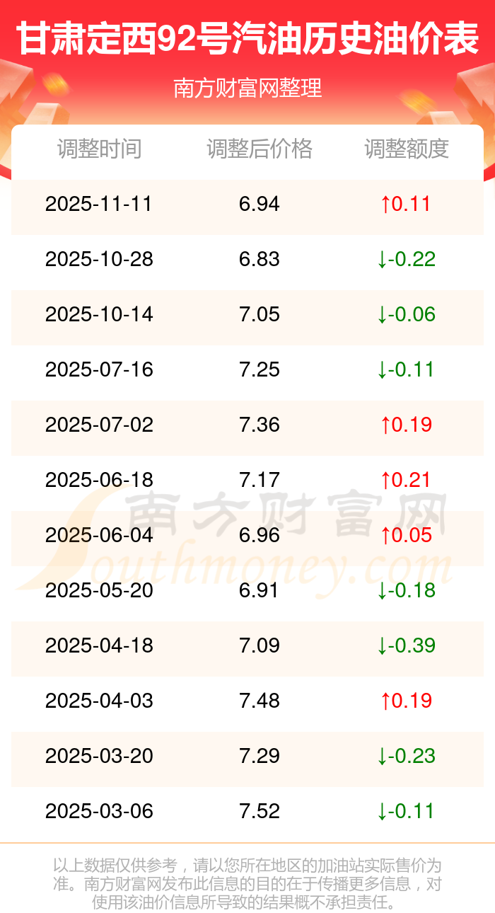 11月19日甘肃定西92号汽油的价格为6.94元/升,本轮油价的调整时间为11月11日,相对上一轮油价调整时间10月28日的价格6.83元/升,上涨了0.11元,上涨幅达1.611%。下一轮油价调整时间11月24日24时,距离现在还有5.5天。