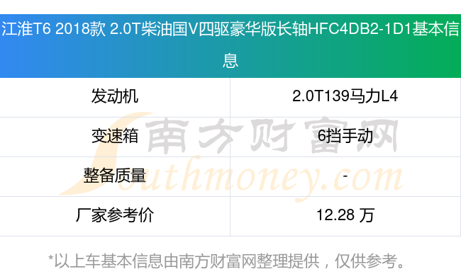 江淮T6 2018款 2.0T柴油国V四驱豪华版长轴HFC4DB2-1D1搭载了一台2.0T139马力L4涡轮增压发动机,采用6挡手动挡变速箱,厂家参考价12.28万元。