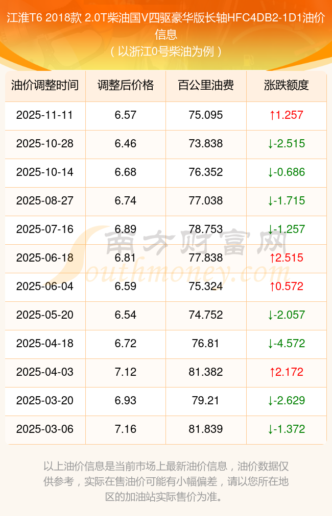 按照11月11日0号柴油最新调整价格6.57元/升来计算(以浙江为例),该车型百公里平均油费为75.095元,按照上一轮10月28日调整价格6.46元/升来计算,百公里平均油费为73.838元,对比上一轮多花1.257元,下一轮油价调整时间为11月24日24时。