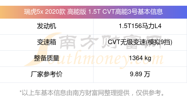 瑞虎5x 2020款 高能版 1.5T CVT高能3号动力上配备的是一台1.5T156马力L4涡轮增压发动机,匹配的是CVT无级变速(模拟9挡)自动档变速箱,燃料形式为汽油,常规整备质量1364kg,厂家参考价9.89万元。