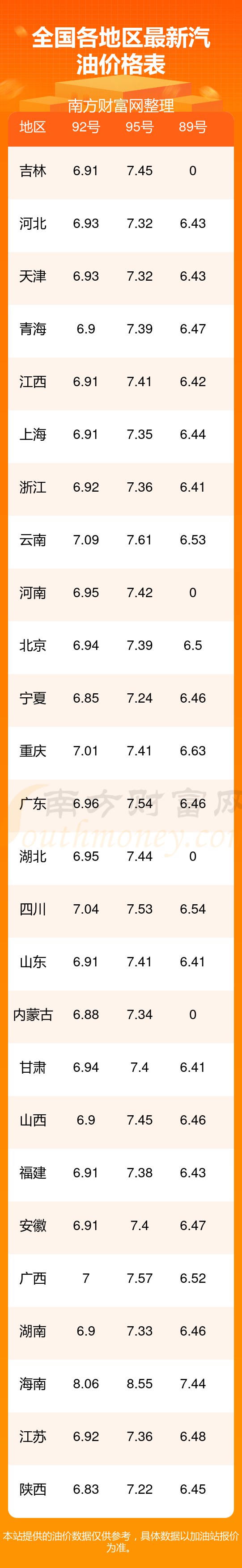 92号汽油平均价格:7元每升,其中,最高为海南,价格8.06元/升,最低为陕西,价格6.83元/升。