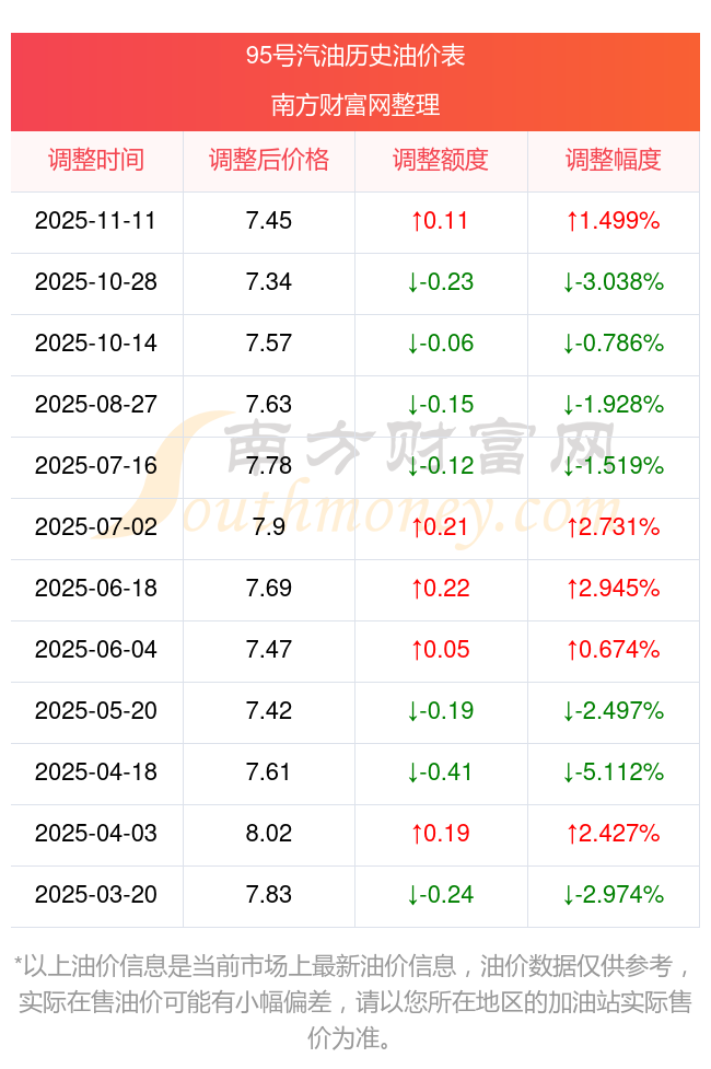 油价调整最新消息:下一轮油价调整时间11月24日24时。11月19日山西汽油、柴油的价格多少钱一升?本轮油价调整时间是11月11日,92号汽油6.9元,涨了0.1元,涨幅达1.47%;95号汽油7.45元,涨了0.11元,涨幅达1.5%;89号汽油6.46元,涨了0.1元,涨幅达1.57%;0号柴油6.64元,涨了0.1元,涨幅达1.53%。