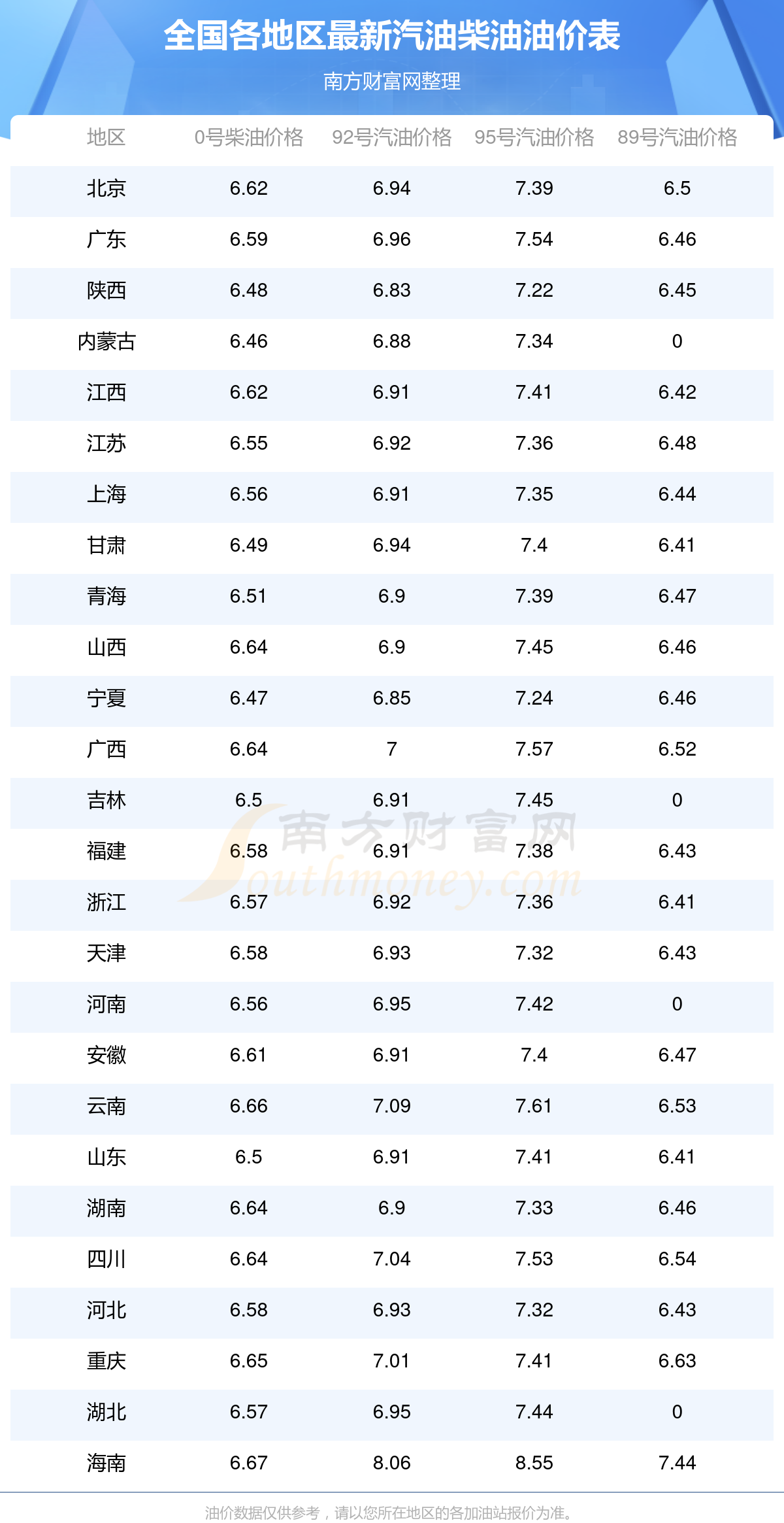 全国95号汽油最新平均价格为:7元每升,其中,最低为陕西,价格为7.22元/升,最高为海南,价格为8.55元/升。