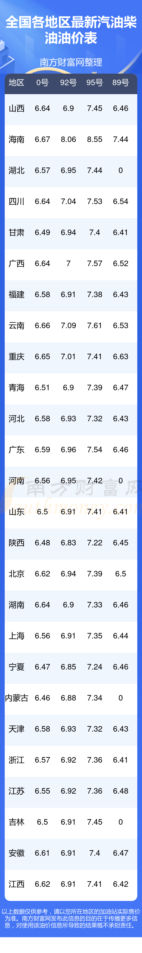 汽油价格调整最新消息:下一轮油价调整11月24日24时开启。油价最新调整时间为11月11日 ,全国92号汽油最新平均价格为:7元每升,其中,最高为海南,价格为8.06元/升,最低为陕西,价格为6.83元/升。全国95号汽油最新平均价格为:7元每升,其中,最高为海南,价格为8.55元/升,最低为陕西,价格为7.22元/升。全国0号柴油最新平均价格为:7元每升,其中,最高为海南,价格为6.67元/升,最低为内蒙古,价格为6.46元/升。全国89号汽油最新平均价格为:7元每升,其中,最高为海南,价格为7.44元/升,最低为浙江,价格为6.41元/升。