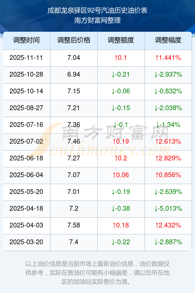 11月19日成都龙泉驿区92号汽油历史油价一览表