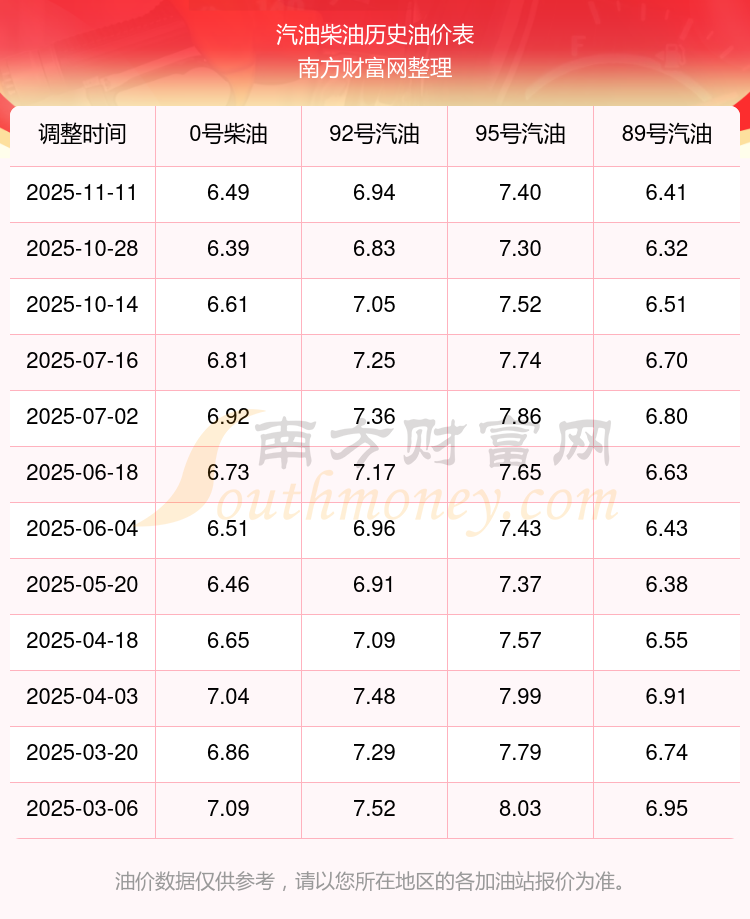 11月19日陇南95号汽油的价格为7.4元/升,这是11月11日调整后的价格,相对上次调整时间10月28日的油价7.3元每升,增了0.1元,增幅达1.37%。下一轮油价调整时间11月24日24时,距离现在还有5.39天。