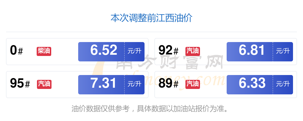 11月19日,江西92号汽油的价格是6.91元每升,本次的调整时间为11月11日,对比上次的调整涨了0.1元,涨1.468%,11月24日24时为下一轮油价调整时间,还有5.39天。