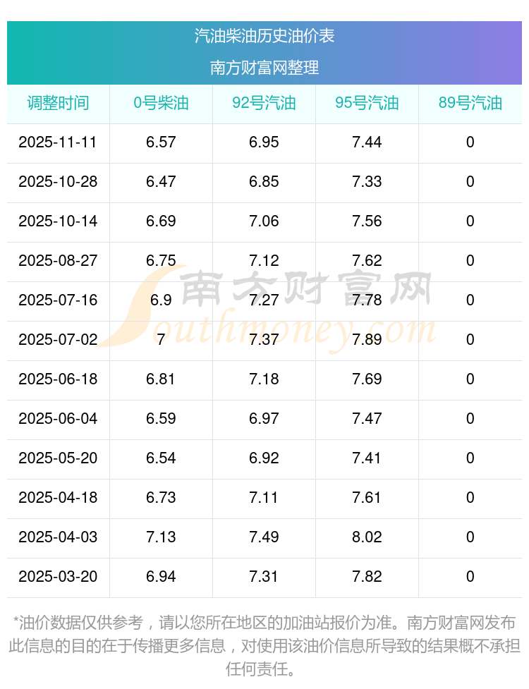 11月19日,湖北鄂州汽油、柴油每升最新价格:本轮的油价调整时间是11月11日,92号汽油为6.95元,上涨了0.1元,上涨幅达1.46%;95号汽油为7.44元,上涨了0.11元,上涨幅达1.5%;0号柴油为6.57元,上涨了0.1元,上涨幅达1.55%。下一轮油价调整时间11月24日24时,距离现在还有5.39天。