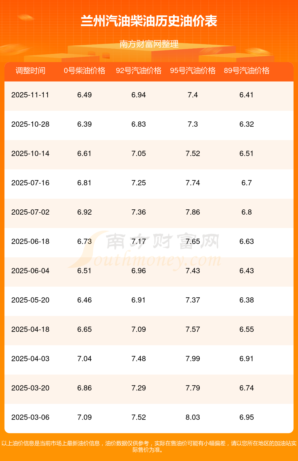 兰州汽油、柴油11月19日每升最新价格为:95号汽油为7.4元,上调了0.1元;92号汽油为6.94元,上调了0.11元;89号汽油为6.41元,上调了0.09元;0号柴油为6.49元,上调了0.1元,调整时间为11月11日。