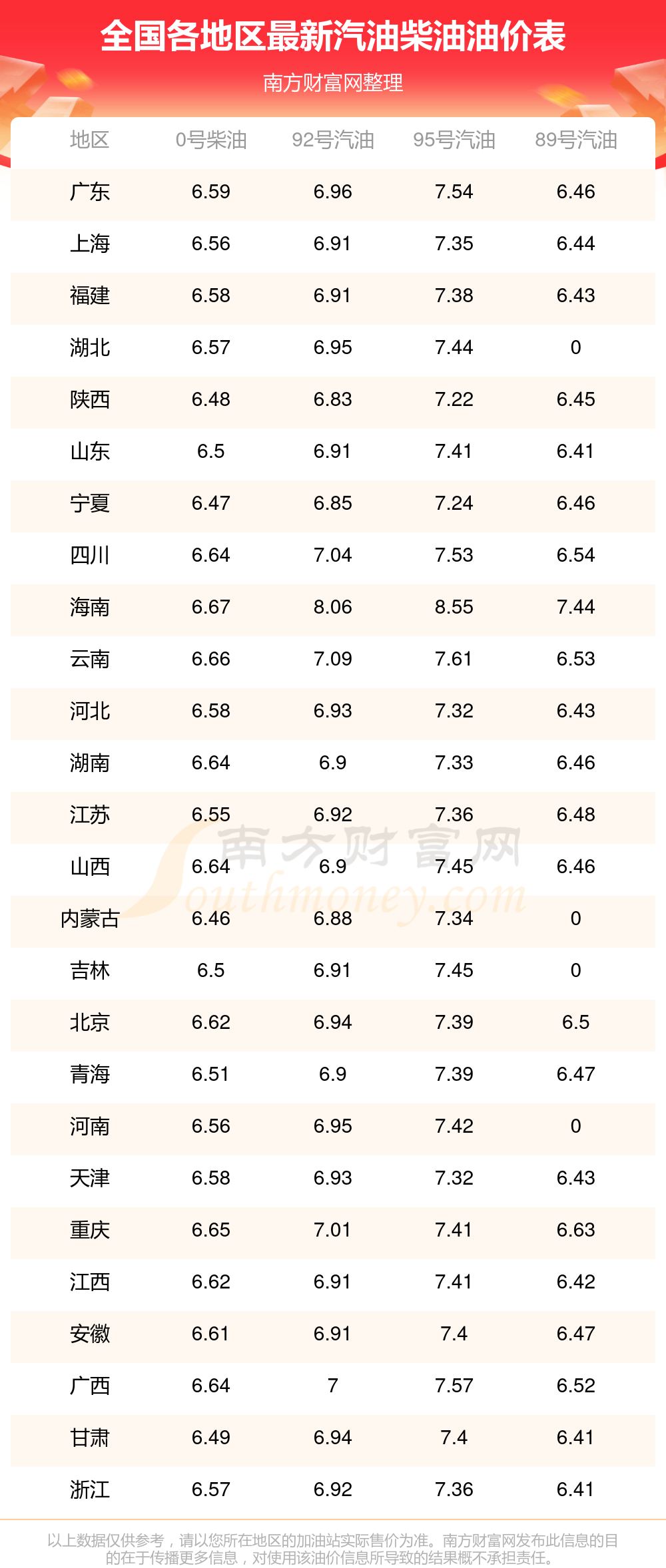 全国各地区最新油价表