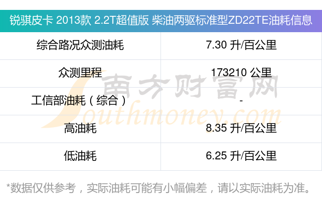 锐骐皮卡 2013款 2.2T超值版 柴油两驱标准型ZD22TE动力上配备的是一台2.2T102马力L4涡轮增压发动机,匹配的是5挡手动挡变速箱,燃料形式为柴油,厂家参考价7.98万元。