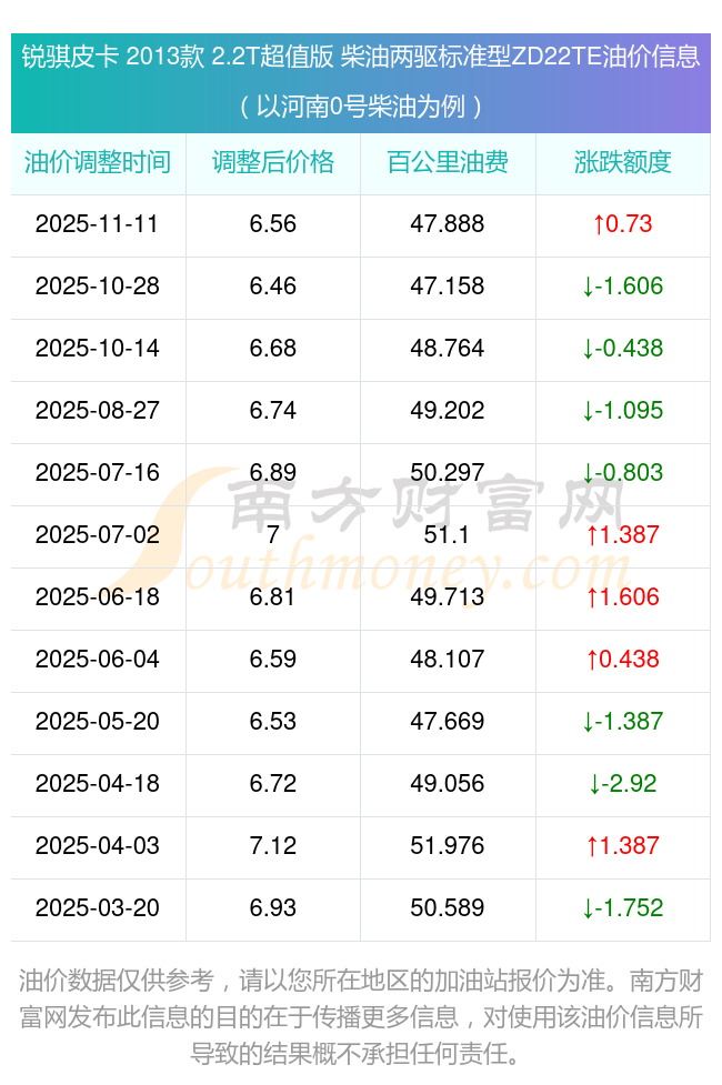 按11月11日0号柴油最新调整价格6.56元每升来计算(以河南为例),该车型百公里平均油费为47.888元,按上一轮10月28日调整价格6.46元每升来计算,百公里平均油费为47.158元,对比上一轮多花0.73元,下一轮油价调整时间为11月24日24时。