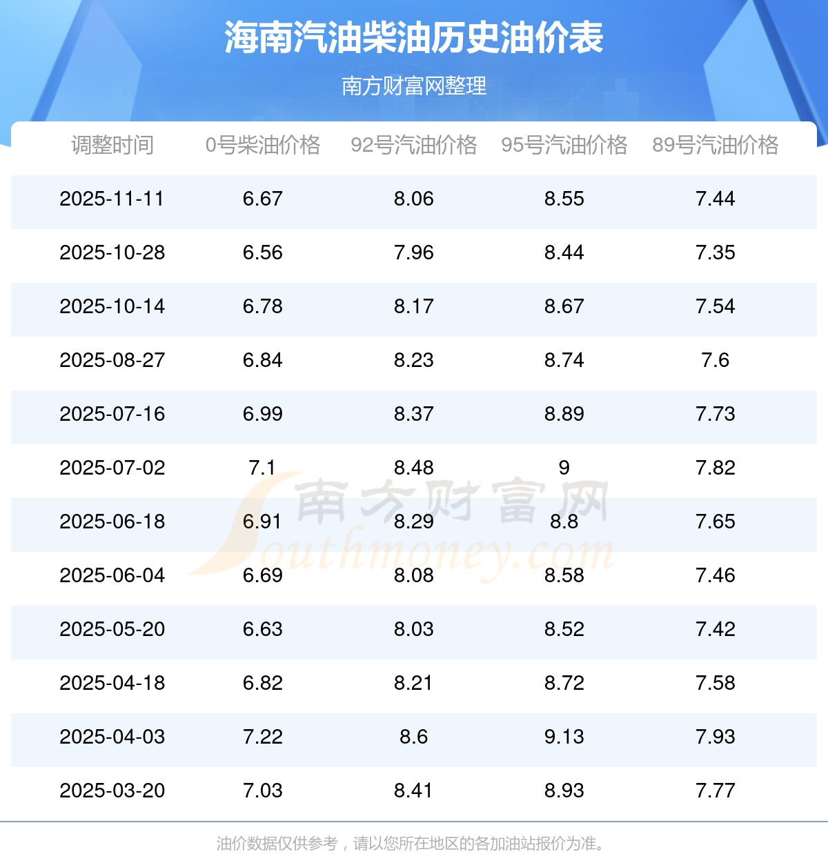 11月19日,海南0号柴油的价格是6.67元每升,本次的调整时间为11月11日,对比上次的调整上调了0.11元,上调1.677%,11月24日24时为下一轮油价调整时间,还有5.35天。