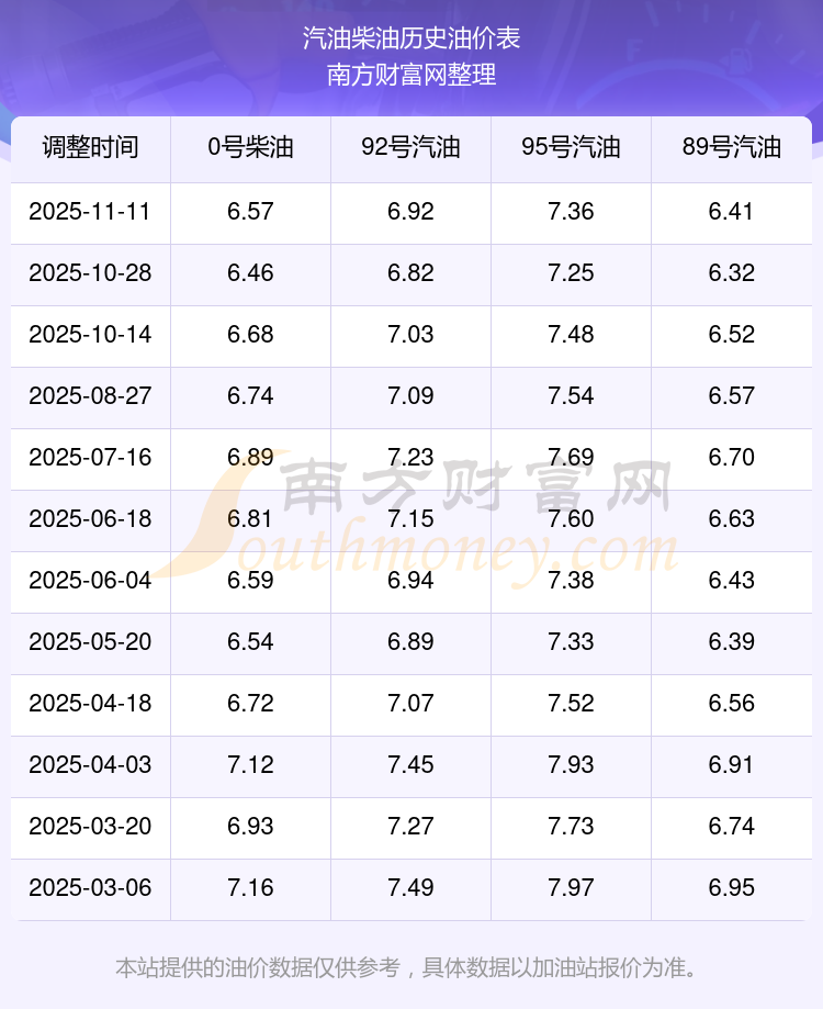 11月19日衢州95号汽油的最新价格(11月11日调整后的价格):7.36元/升,相对上次调整增了0.11元。下一轮油价调整时间11月24日24时,距离现在还有5.35天。