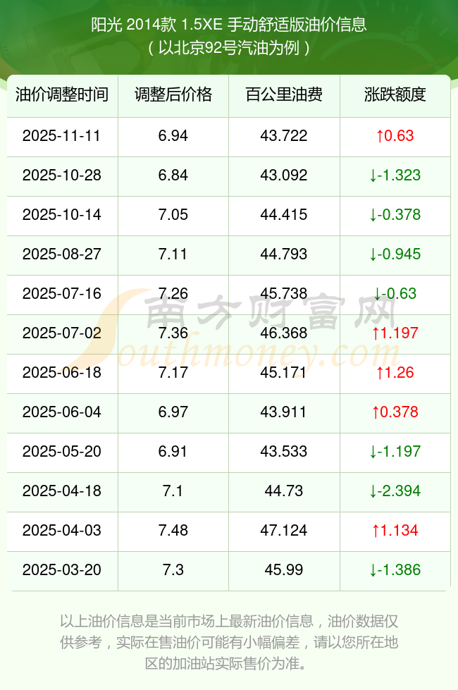 根据11月11日92号汽油最新调整价格6.94元/升来计算(以北京为例),该车型每百公里的平均油费是43.722元,上一轮10月28日调整价格6.84元每升来计算,每百公里的平均油费是43.092元,对比上一轮多花0.63元,下一轮的油价调整时间是11月24日24时。