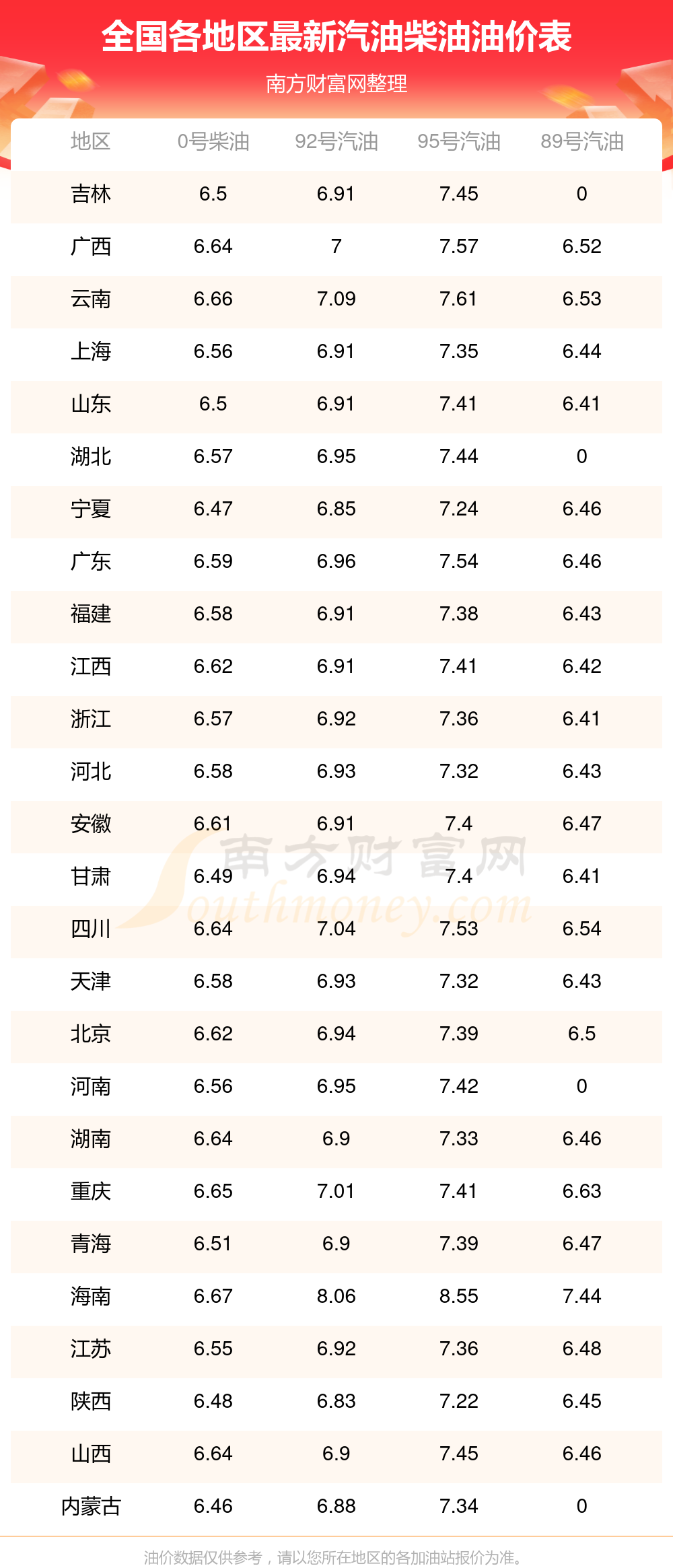 全国各地区最新汽油价格表