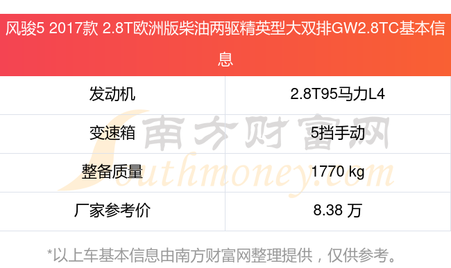 风骏5 2017款 2.8T欧洲版柴油两驱精英型大双排GW2.8TC动力上搭载的是一台2.8T95马力L4涡轮增压发动机,匹配5挡手动挡变速箱,燃料形式为柴油,常规整备质量1770kg,厂家参考价8.38万元。