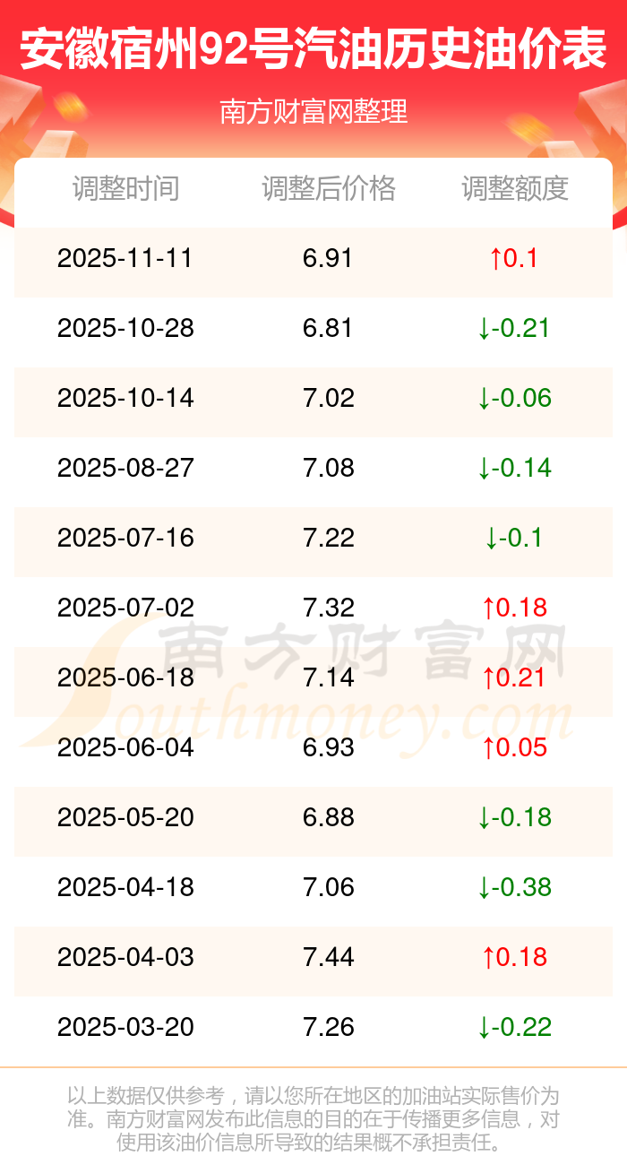 安徽宿州92号汽油11月19日的最新价格(11月11日油价调整后的价格):安徽宿州92号汽油6.91元/升,相对上次调整时间10月28日的油价6.81元每升,上升了0.1元,上升1.468%。下一轮油价调整时间11月24日24时,距离现在还有5.29天。