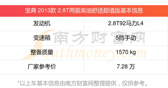 在动力上,宝典 2013款 2.8T两驱柴油舒适超值版配备的是一台2.8T92马力L4涡轮增压发动机,匹配的是5挡手动挡变速箱,燃料形式为柴油,常规整备质量1570kg,厂家参考价7.28万元。