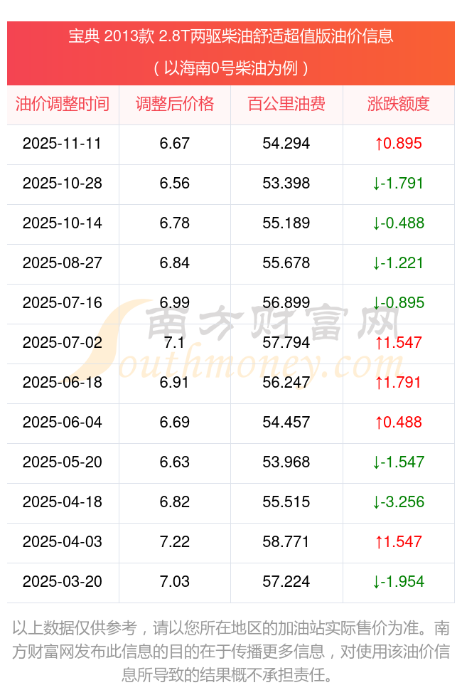 依照11月11日0号柴油最新调整价格6.67元/升来计算(以海南为例),该车型百公里的平均油费是54.294元,依照上一轮10月28日调整价格6.56元/升来计算,百公里的平均油费是53.398元,对比上一轮多花0.895元,下一轮的油价调整时间11月24日24时。
