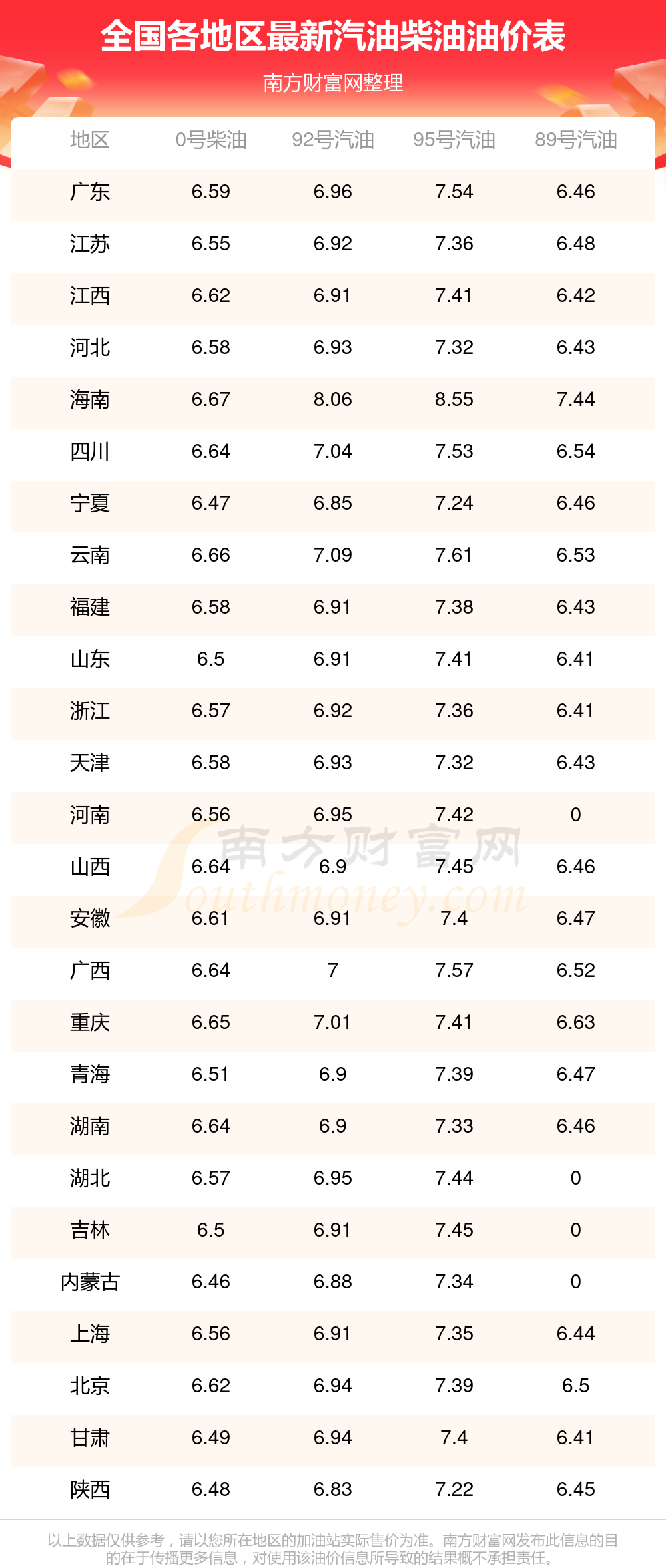 全国各地区最新油价表