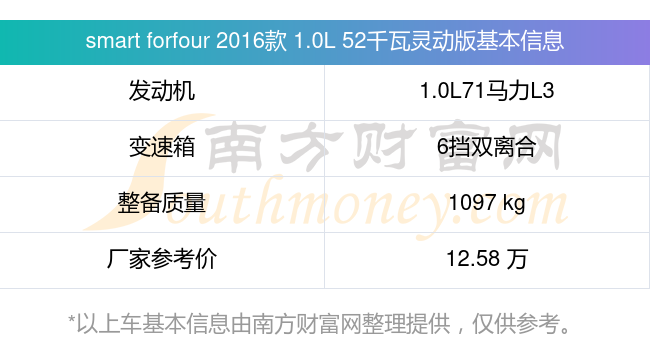 smart forfour 2016款 1.0L 52千瓦灵动版动力方面,搭载的是一台1.0L71马力L3自然吸气发动机,匹配6挡双离合自动档变速箱,燃料形式为汽油,常规整备质量1097kg,厂家参考价12.58万元。