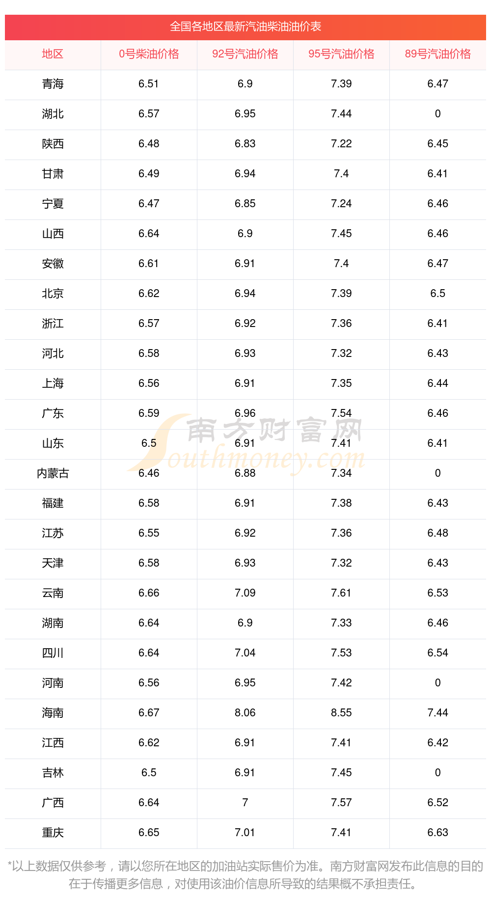本次油价的调整时间为11月11日,调整后全国92号汽油平均价格为7元每升,其中,最低的是陕西,6.83元每升,最高的是海南,8.06元每升。全国95号汽油平均价格为7元每升,其中,最低的是陕西,7.22元每升,最高的是海南,8.55元每升。全国0号柴油平均价格为:7元每升,其中,最低的是内蒙古,6.46元每升,最高的是海南,6.67元每升。全国89号汽油平均价格为7元每升,其中,最低的是浙江,6.41元每升,最高的是海南,7.44元每升。,下一轮油价调整时间11月24日24时,距离现在还有5.27天。