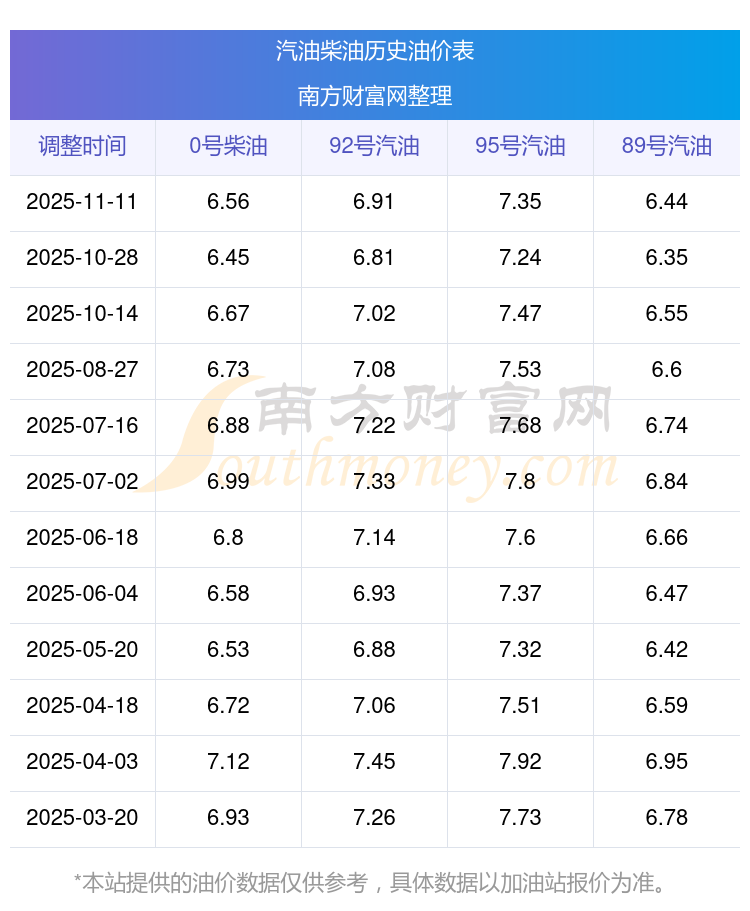 11月19日松江92号汽油价格查询:每升6.91元(11月11日油价调整后的价格),相对上次调整时间10月28日的油价6.81元每升,上涨了0.1元,上涨1.468%。下一轮油价调整时间11月24日24时,距离现在还有5.27天。