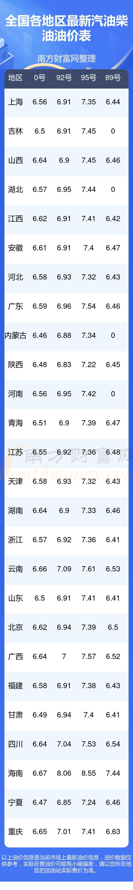 全国95号汽油最新平均价格为:7元每升,其中,最高为海南,价格为8.55元/升,最低为陕西,价格为7.22元/升。