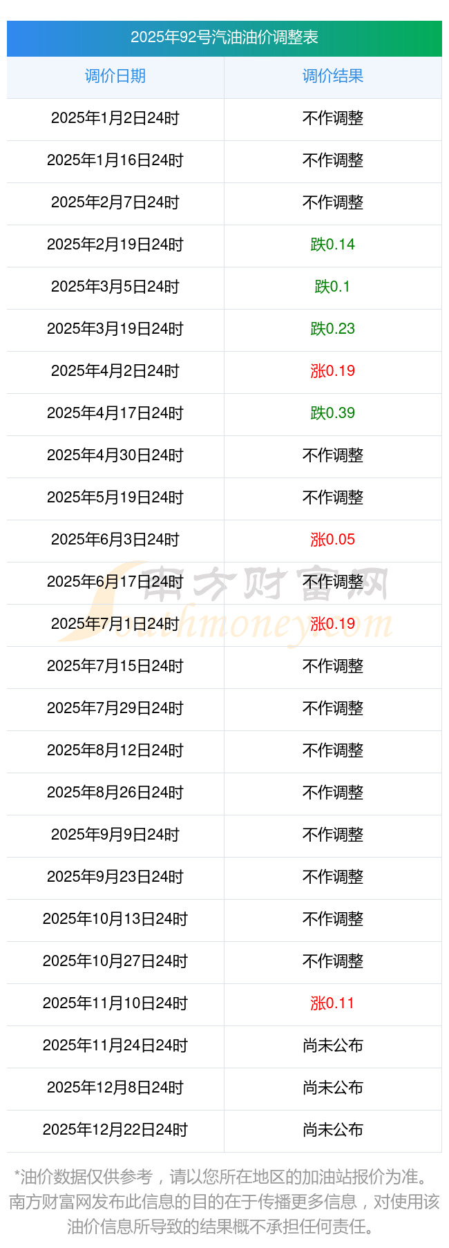 2025年11月19日全国油价调整及价格一览表