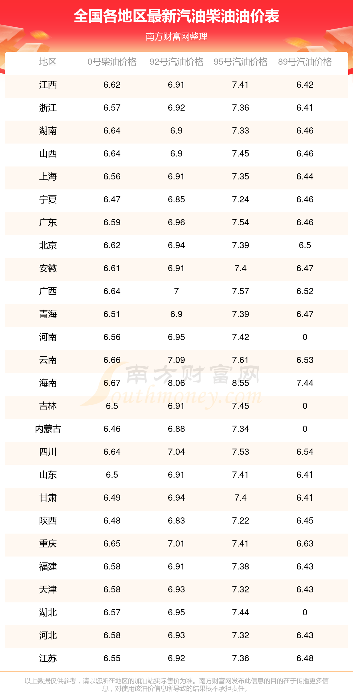 油价调整最新消息:本轮油价的调整时间为11月11日,调整后全国92号汽油平均价格为7元每升,其中,最低为陕西的6.83元/升,最高为海南的8.06元/升。全国95号汽油平均价格为7元每升,其中,最低为陕西的7.22元/升,最高为海南的8.55元/升。全国0号柴油平均价格为:7元每升,其中,最低为内蒙古的6.46元/升,最高为海南的6.67元/升。全国89号汽油平均价格为7元每升,其中,最低为浙江的6.41元/升,最高为海南的7.44元/升。下一轮汽油价格调整时间11月24日24时,距离现在还有5.25天。