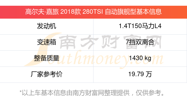 高尔夫·嘉旅 2018款 280TSI 自动旗舰型动力上配备的是一台1.4T150马力L4涡轮增压发动机,匹配的是7挡双离合自动档变速箱,燃料形式为汽油,常规整备质量1430kg,厂家参考价19.79万元。