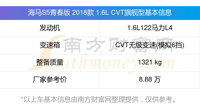 在动力上,海马S5青春版 2018款 1.6L CVT旗舰型配备的是一台1.6L122马力L4自然吸气发动机,匹配的是CVT无级变速(模拟6挡)自动档变速箱,燃料形式为汽油,常规整备质量1321kg,厂家参考价8.88万元。