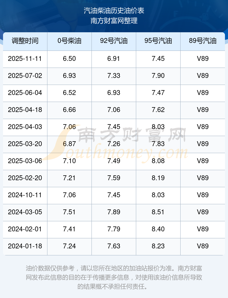 11月19日,白城92号汽油的价格为6.91元/升,这是11月11日油价调整后的价格,对比上一轮油价调整时间7月2日的价格6.8元每升,上调了0.11元,上调幅达1.618%。下一轮油价调整时间11月24日24时,距离现在还有5.24天。