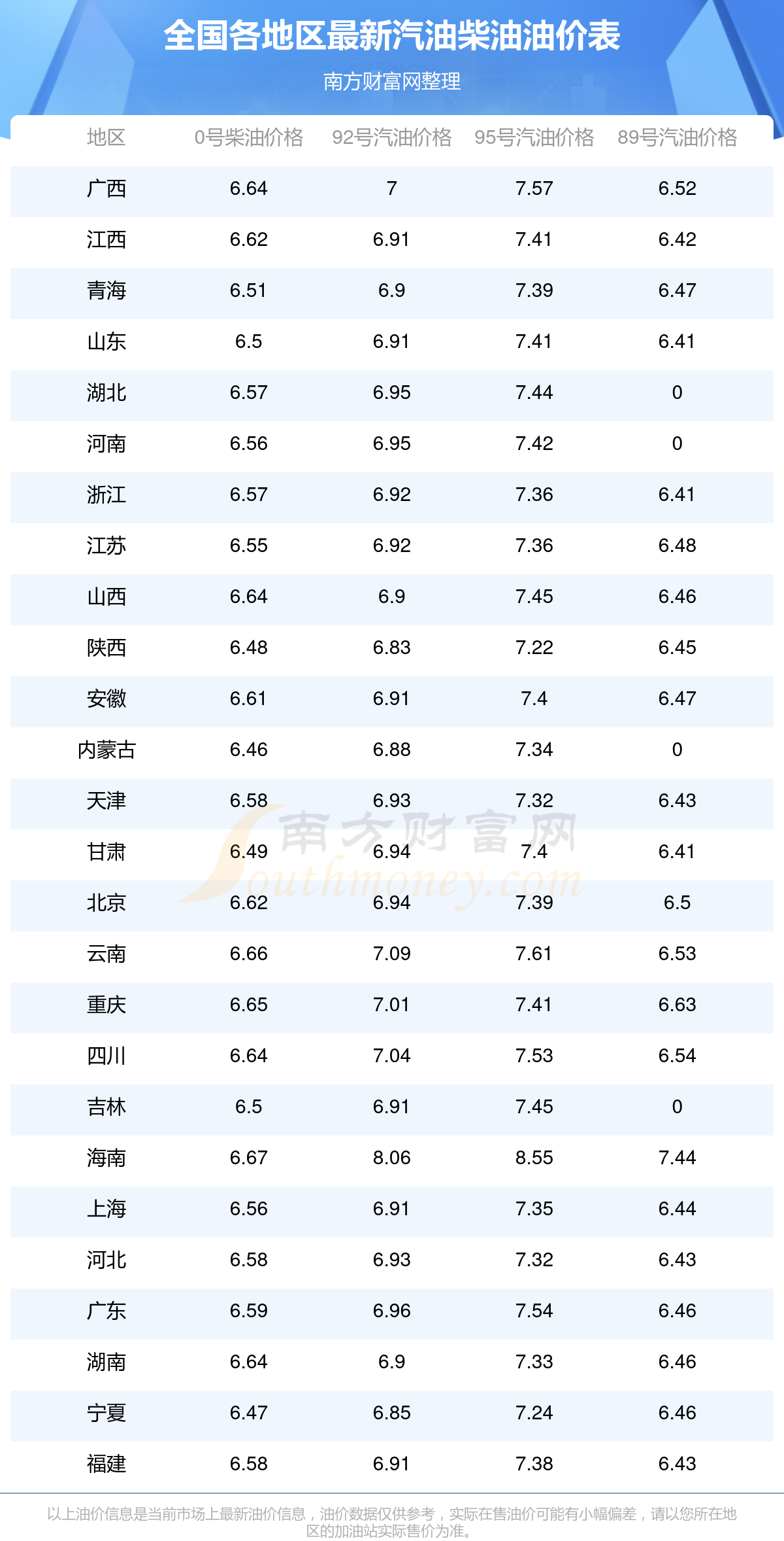 0号柴油平均价格:7元每升,其中,最高为海南,价格6.67元/升,最低为内蒙古,价格6.46元/升。