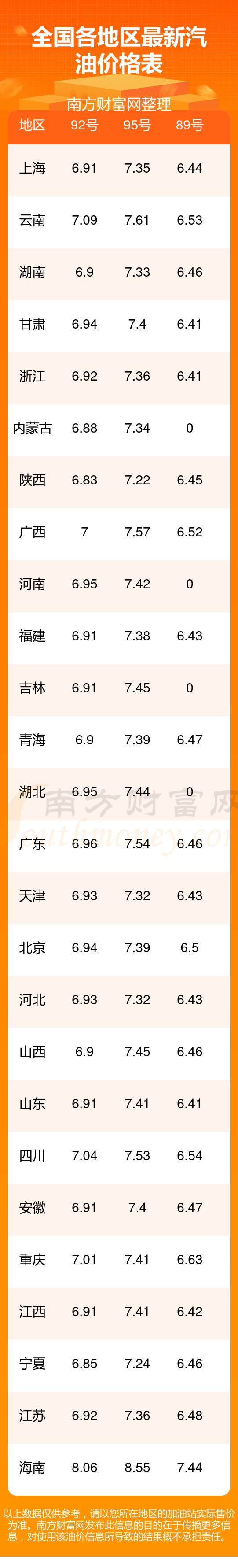 以上油价信息是当前市场上最新油价信息,油价数据仅供参考,实际在售油价可能有小幅偏差,请以您所在地区的加油站实际售价为准。