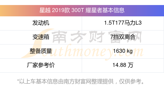 在动力方面,星越 2019款 300T ??星者搭载的是一台1.5T177马力L3涡轮增压发动机,匹配7挡双离合自动档变速箱,燃料形式为汽油+48V轻混系统,常规整备质量1630kg,厂家参考价14.88万元。