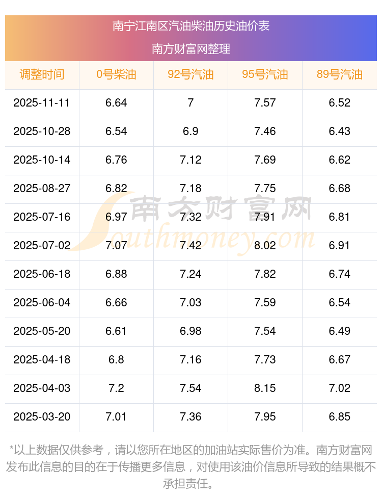 油价调整最新消息:下一轮油价调整时间11月24日24时。11月19日,南宁江南区汽油、柴油每升最新价格为:92号汽油为7元,上涨了0.1元;95号汽油为7.57元,上涨了0.11元;89号汽油为6.52元,上涨了0.09元;0号柴油为6.64元,上涨了0.1元,调整时间为11月11日。