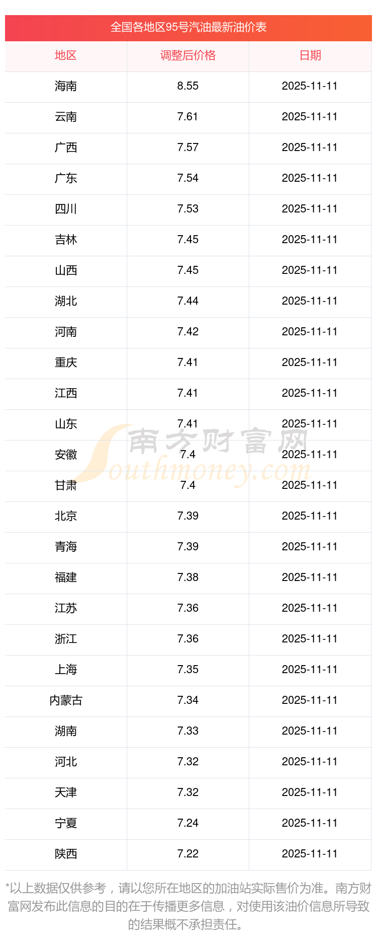 11月20日,福建95号汽油的价格是7.38元每升,本次的调整时间为11月11日,对比上次的调整升了0.11元,升1.513%,11月24日24时为下一轮油价调整时间,还有4.77天。