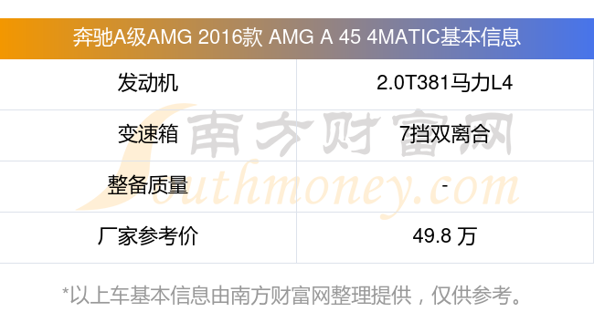 奔驰A级AMG 2016款 AMG A 45 4MATIC动力上搭载的是一台2.0T381马力L4涡轮增压发动机,匹配7挡双离合自动档变速箱,燃料形式为汽油,厂家参考价49.8万元。