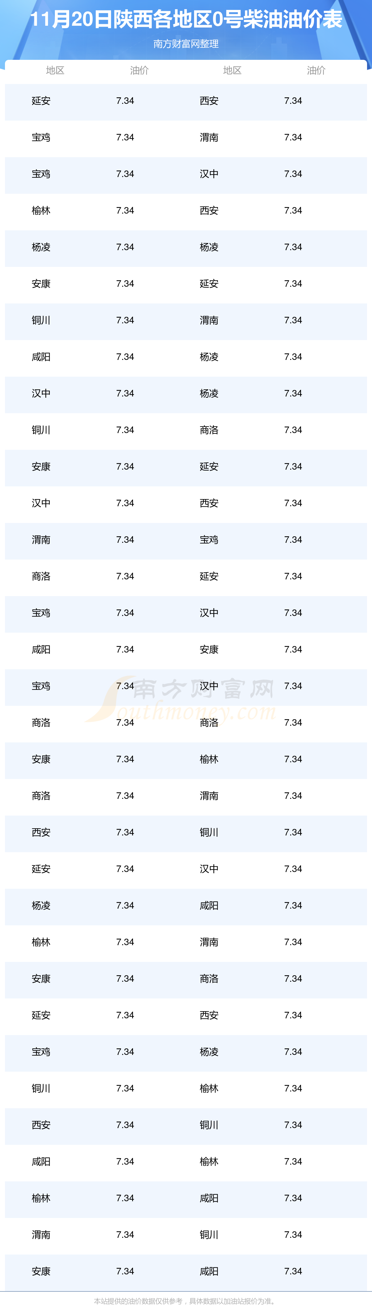 2025年11月20日陕西0号柴油最新价格一览表