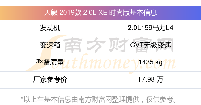在动力上,天籁 2019款 2.0L XE 时尚版配备的是一台2.0L159马力L4自然吸气发动机,匹配的是CVT无级变速自动档变速箱,燃料形式为汽油,常规整备质量1435kg,厂家参考价17.98万元。
