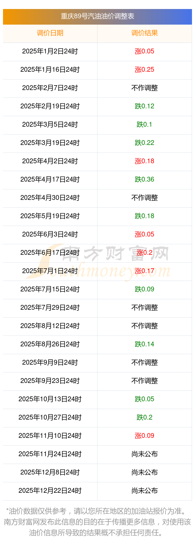 重庆2025年汽油价格调整时间表(11月20日)