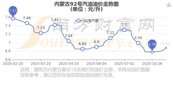 11月20日内蒙古汽油、柴油的价格为11月11日调整后的价格。每升最新价格为:92号汽油6.88元,增了0.1元;95号汽油7.34元,增了0.1元;0号柴油6.46元,增了0.1元。