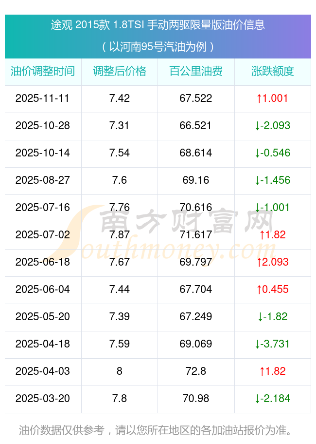 按11月11日95号汽油最新调整价格7.42元每升来计算(以河南为例),该车型百公里平均油费为67.522元,按上一轮10月28日调整价格7.31元每升来计算,百公里平均油费为66.521元,对比上一轮多花1.001元,下一轮油价调整时间为11月24日24时。