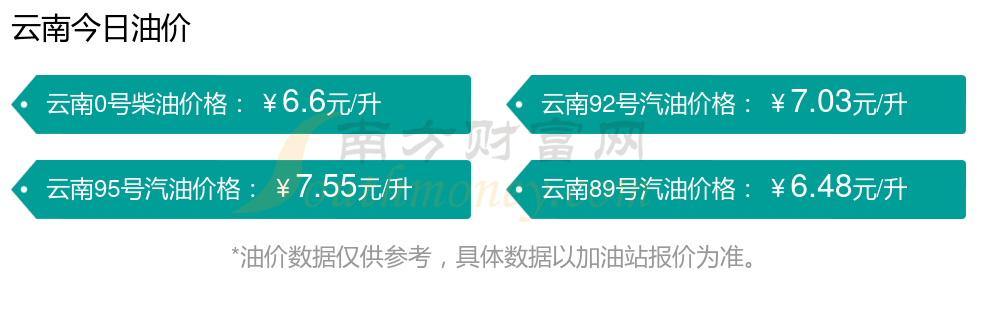 11月25日云南汽油、柴油的价格为11月25日调整后的价格。每升最新价格为:92号汽油7.03元,减了0.06元;95号汽油7.55元,减了0.06元;89号汽油6.48元,减了0.05;0号柴油6.6元,减了0.06元。