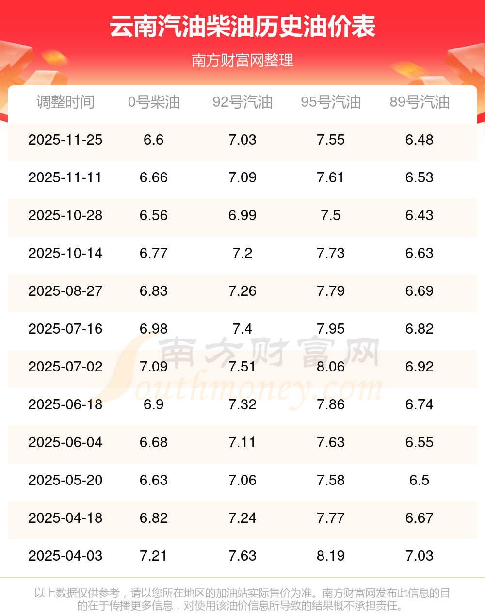 云南2025年最新汽油柴油历史油价表