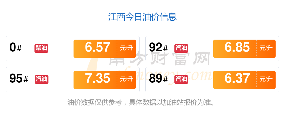 汽油价格调整最新消息:下一轮油价调整时间12月8日24时。江西汽油、柴油11月25日每升最新价格多少钱一升?本次油价调整时间为11月25日,92号汽油为6.85元,跌了0.06元;95号汽油为7.35元,跌了0.06元;89号汽油为6.37元,跌了0.05;0号柴油为6.57元,跌了0.05元。