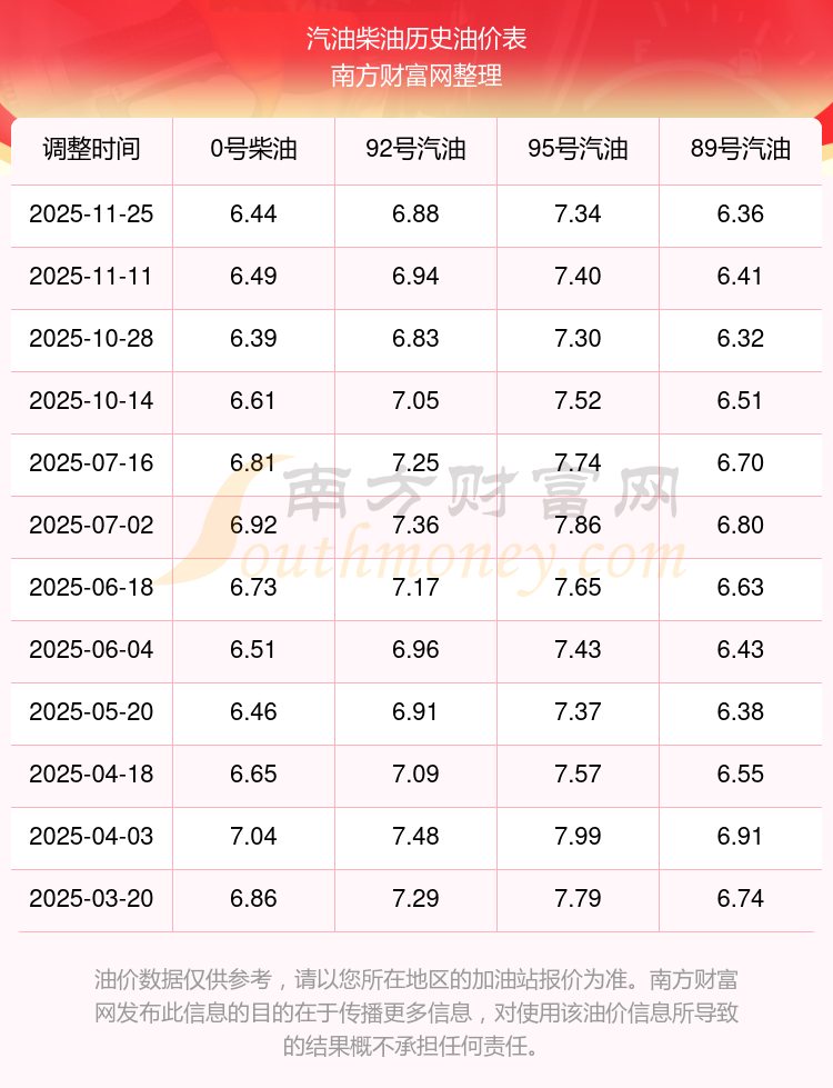 11月25日酒泉95号汽油的价格为7.34元每升,本次调整时间为11月25日,相对上次调整时间11月11日的油价7.4元每升,下跌了0.06元,下跌幅达0.811%。下一轮油价调整时间12月8日24时,距离现在还有13.63天。
