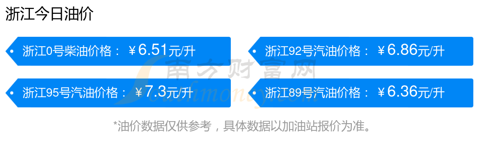 11月25日,浙江汽油、柴油每升最新价格为:调整时间为11月25日,92号汽油为6.86元,下降了0.06元,下降幅达0.87%;95号汽油为7.3元,下降了0.06元,下降幅达0.82%;89号汽油为6.36元,下降了0.05元,下降幅达0.78%;0号柴油为6.51元,下降了0.06元,下降幅达0.91%。